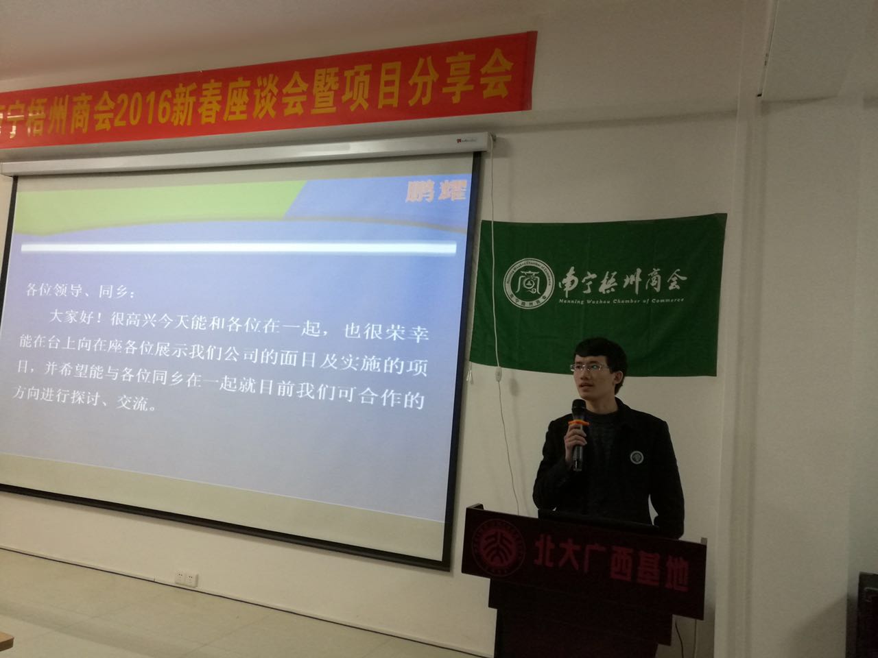 2016年1月24日,我公司市場部經(jīng)理胡森代表我司參加南寧梧州商會2016年新春座談暨項目分享會,并在會上進行了企業(yè)展示及對可合作的方向進行探討。